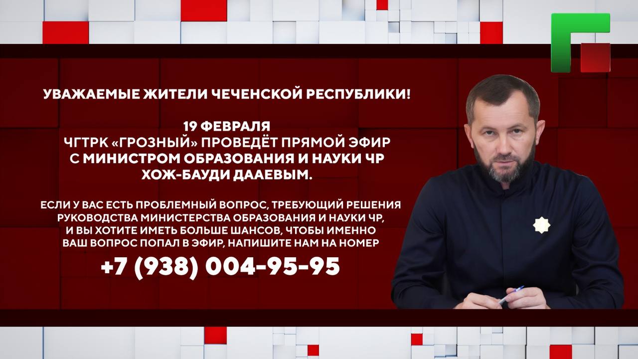 15.02.202519 февраля в 18:00 на телеканале ЧГТРК «Грозный» состоится прямой эфир программы «Особый разговор».
